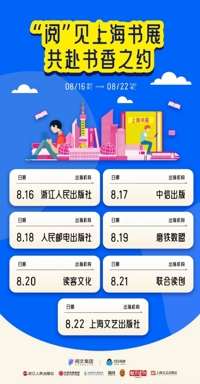 除了丰富的线下展陈,阅文旗下QQ阅读还同步上线了“上海书展云阅好书”专题,携手浙江人民出版社、中信出版、人民邮电出版社、磨铁数盟、读客文化、联合读创和上海文艺出版社共同推介“书展同款好书”。